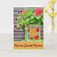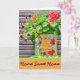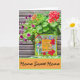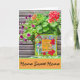 Esta tarjeta está diseñada con una pequeña pintura apoyada en una maceta de flores de verano. Las palabras en la pintura dicen "Donde las Preocupaciones se Derriten Como Gotitas de Limón". Creo que el entorno hace una tarjeta de Nuevo Hogar o tarjeta de bienvenida perfecta. Las palabras se pueden personalizar fácilmente para diferentes ocasiones.