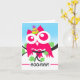 Hoo-Ray, es tu cumpleaños, Lechuza de cumpleaños divertida, tarjeta de saludo de papel. La tarjeta presenta un ilustracion lindo de un búho rosa con ojos grandes, un juego de palabras de búho y una rama de color oscuro con hojas verde claro. Un gracioso gorra de cumpleaños con rayas y una pompa morada se sienta en la cabeza de la lechuza. Arte, imagen y verso © Shoaff Ballanger Studios.