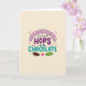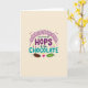 Designed with a creamy beige background, this card centers the phrase “I’m just here for HOPS & the CHOCOLATE” in a tall, vertical layout that reads like a shared joke between close friends 🐰. Above the words, a looping magenta decoration curves like candy ribbons, dotted with small fuchsia hearts that feel like little nods of affection. The smaller words “I’m just here for” and “& the” sit neatly around the main line in dark lettering, keeping the eye moving down the page. “HOPS” stands out in plum purple, while “CHOCOLATE” lands in deep teal, giving the message a fun contrast without being loud. Around the text, tiny hearts in pink, yellow, and green mingle with short dash marks, like confetti scattered during a cozy spring get-together 🌷. At the bottom, two long seed-pod shapes anchor the design, one earthy brown and the other emerald green, side by side as if keeping each other company. The magenta ribbon-like arc sits above the centered text, and the paired pods rest along the lower edge beneath the last line.