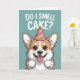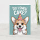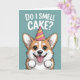 Una linda y graciosa tarjeta de cumpleaños con un adorable personalizado corgi usando un fiesta gorra y sonriendo con emoción bajo la frase "¿Huelo pastel?". Perfecto para los amantes del perro, amigos y todo aquel que disfrute del humor de cumpleaños juguetón.