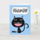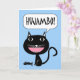 ¡Hujambo! Hola tarjeta de felicitación escrita en suajili. Ilustracion de un gato negro con un esqueleto de los pescados en sus pies. Coloreado en azul, negro, blanco, y rosa. El ilustracion tiene una mirada del dibujo animado y es un diseño estilizado. Esconda el interior para su mensaje personal. Estudios/2015 de Shoaff Ballanger del © de la imagen y del verso.