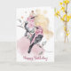 Dos colibríes rosas y grises se unen en una rama en la parte delantera de esta carta de cumpleaños. Detrás de ellos hay una bandeja de pintura de oro y rosa, con adornos de oro rosa. El texto del guión de abajo dice "Feliz cumpleaños". El interior de la tarjeta tiene dos campos de texto personalizado, que puede usar para decir lo que quiera. Esta elegante tarjeta de bonito es apropiada para cualquiera.