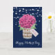 Hermosa tarjeta del Día de la Madre azul marino y rosa con hortensias rosadas y flores de bebé en un frasco de mason. Personalice esta plantilla para crear una tarjeta muy linda del Día de la Madre. Esta tarjeta se puede personalizar para cualquier ocasión.