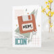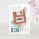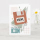 Tarjeta del Día de la Madre con tema de los 90 que incluye una ilustración de un disquete y gráficos inspirados en los noventa, como estrellas y rayos. El texto dice: "Mamá, eres un icono"