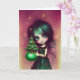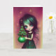 Mia, ilustración de Navidad tarjeta de felicitación de Ricaso - una ilustración de una niña con pelo verde y vestido verde sosteniendo un pequeño árbol de Navidad.