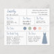 Una tarjeta de información de dama de honor azul polvoriento, que incluye información sobre la fecha y ubicación de la boda, los colores de la boda, el grupo de la novia, el vestido de dama de honor y un mensaje de propuesta de dama de honor. En la esquina superior izquierda, el nombre de la dama de honor está escrito en una letra cursiva azul polvoriento. En la esquina inferior derecha, hay un vestido azul polvoriento. En el centro, están los colores de la boda en círculos. Los colores, incluyendo el color del vestido de novia, se pueden cambiar.