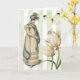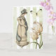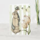 "Elizabeth" es una tarjeta de felicitación inspirada en Jane Austen que presenta una lámina de moda vintage que he restaurado con cariño, tulipanes marfil y mariposa blanca sobre un fondo azul y blanco, perfecta para los fans de la autora Jane Austen. .©Julie McIverthat