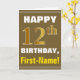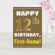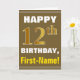 Las características del este de felicitación diseño cumpleaños-temáticas simples de la tarjeta un deseo caliente del cumpleaños tienen gusto del "12mo CUMPLEAÑOS FELIZ, Primero-Nombre!" en el frente, en texto intrépido en un fondo de color marrón. El número del cumpleaños tiene un falso/una imitación oro-como mirada del colorante. El nombre en el frente puede ser modificado para requisitos particulares. Las características interiores un mensaje del cumpleaños que puede ser personalizado. Una tarjeta de felicitación como esto podría ser una manera de la diversión de entregar deseos del cumpleaños alguien que está celebrando su duodécimo cumpleaños. [~Z0000281]