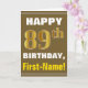 Las características del este de felicitación diseño cumpleaños-temáticas simples de la tarjeta un deseo caliente del cumpleaños tienen gusto del "89.o CUMPLEAÑOS FELIZ, Primero-Nombre!" en el frente, en texto intrépido en un fondo de color marrón. El número del cumpleaños tiene un falso/una imitación oro-como mirada del colorante. El nombre en el frente puede ser personalizado. Las características interiores un mensaje del cumpleaños que puede ser personalizado. Una tarjeta de felicitación como esto podría ser una manera de la diversión de entregar deseos del cumpleaños alguien que está celebrando su noveno cumpleaños ochenta. [~Z0000281]