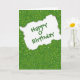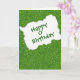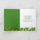A white card nestled among vibrant green Irish shamrock leaves for a St. Patrick's Day birthday or any day birthday.