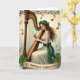 Designed with a serene Irish music scene, the card shows a graceful woman leaning close to a golden harp as if sharing a private song with someone just out of view 💚. Her auburn hair falls in soft waves beneath a wreath of green leaves, and her off‑white gown carries small gold accents that catch the light. An emerald sash tied in a neat bow wraps her waist, echoing the shamrocks tucked into the lower corners ☘️. The harp is rendered in warm wood tones with carved details and fine, shining strings, while her lowered eyes and careful hand position suggest a tender, unhurried moment. Across the pale background, tiny gold notes drift near a traditional music staff, adding motion without crowding the scene. The phrase “St Patrick’s Greeting” sits on a scroll banner along the bottom, with dark lettering set against the light parchment-like ribbon for easy reading. Soft gold notes float diagonally above her shoulder toward the upper right, fading into the light backdrop.