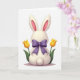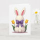 This card features a small bunny 🐰 seen from behind on a bright white background, giving the scene a shy, affectionate feel as if it’s waiting for someone special to notice. The bunny is shaded in creamy ivory with soft gradients, and its long ears rise upward with a light pink tint on the inner edges. A rich violet ribbon is tied into a glossy bow at the base of its neck, adding a dressed-up touch like it’s ready for a sweet springtime visit. A round, fluffy white tail sits just below, with textured fur that contrasts against the smoother body and sleek ribbon. On either side of the bunny, two yellow flowers 🌷 stand in a balanced arrangement, each with green stems and leafy accents that frame the center figure like a gentle welcome. The greeting text sits near the top in a soft lavender tone, with smaller text placed near the bottom in muted gray to keep the focus on the illustration. A faint shadow beneath the bunny and flowers lightly grounds the scene on the white space.