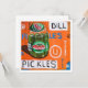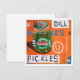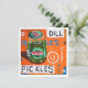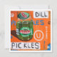 Impresión artística de un frasco de pepinillos con fondo naranja y texto.