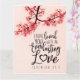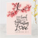 La tarjeta de saludo con cita inspiradora muestra una fotografía de la naturaleza de una rama de flores rosadas sobre un fondo rosa. Incluye una parte de un versículo bíblico alentador, Jeremías 31:3, "Te he amado con un amor eterno". El saludo se puede personalizar o eliminar para una nota escrita a mano y la tarjeta se puede utilizar para muchas ocasiones. Foto de Patrick Shaun.