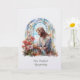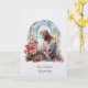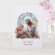 Esta elegante tarjeta de condolencias personalizada presenta una serena imagen de vidrio emplomado de Nuestro Señor Jesús admirando un delicado ramo de flores silvestres. Representada en suaves tonos pastel de azul, blanco y rosa, la obra de arte evoca paz, esperanza y un suave recuerdo en momentos de pérdida.