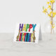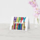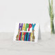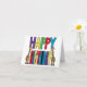 Diseño de tarjeta de felicitación de cumpleaños con jirafas caprichosas, divertidas y únicas paradas junto a letras de bloque coloridas y felices es popular entre los amantes de las jirafas y los animales para celebrar cumpleaños.