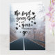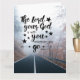 La carta inspiradora de las escrituras de la tarjeta de saludo representa una fotografía de un camino rodeado de árboles. Presenta la Biblia Verse Joshua 1:9, "¿No te he mandado? Sé fuerte y valiente. No temáis; no os desaniméis, porque Jehovah vuestro Dios estará contigo dondequiera que vayas."_