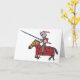Un caballero medieval cabalgando en un torneo de jousting. Usa casco con cintas, armaduras y lleva una lanza y un escudo. El caballo lleva un abrigo. Una divertida imagen de estilo personalizado para los amantes de la moda y de la caballerosidad y el desfile.