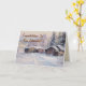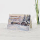 La escena invernal rústica cuenta con cabinas cubiertas de nieve y suelo con fondo de colinas onduladas. El texto dice felicitaciones por tu jubilación.