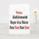 Tarjeta de felicitación para una persona que se va a retirar. Feliz Jubilación Espero que te diviertas" Cartas negras y rojas.