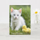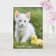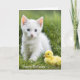 Un gatito blanco lindo con hierba verde y pato amarillo de primavera para el cumpleaños de un amigo.