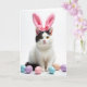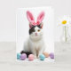 Designed with a studio-style look, this card features a white cat with a dark patch framing one eye and ear, sitting calmly against a plain white background. A fluffy pink headband with tall bunny ears and a small bow rests on its head, adding a sweet, slightly silly touch 🐰. The cat’s golden-amber eyes look straight ahead with a gentle, friendly focus, like it’s posing for someone it trusts. Soft, diffused lighting highlights the fur and whiskers, keeping the scene tender and close-up rather than dramatic. Near the bottom, several smooth egg-shaped decorations in pastel blue, lavender, and soft pink are arranged around the cat’s paws, bringing in a springtime feel 🌷. The greeting “Happy Easter” appears near the top in pink lettering, with a smaller line of text centered beneath it in light gray. The white background stays uncluttered, letting the pink ears and pastel eggs stand out clearly.
