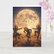 Tres espantapájaros con cabezas de calabaza bailando en un campo bajo una luna de cosecha. Sus ropas andrajosas se aletean mientras los cuervos se dispersan por el brillante cielo. Esta tarjeta de baile espantapájaros celebra Halloween en estilo rústico.