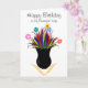 Deseo de cumpleaños de esposa. Deja un mensaje especial dentro o personaliza. Flores coloridas y hojas de plumas que incluyen rosa, azul, amarillo, verde, naranja reunidas en un jarrón negro. Flores individuales más pequeñas dentro del lado izquierdo de la carta. Diseño original de obras de arte y tarjetas © TamiraZDesigns