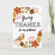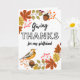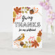 Dando gracias, tarjeta de felicitación de Acción de Gracias para una novia maravillosa. Personalizar la parte delantera de la tarjeta como quieras. Diseño de flores con temática otoñal con una variedad de hojas, bellotas, bayas y un ave. Derechos reservados © Shoaff Ballanger Studios, 2022.