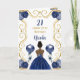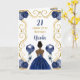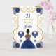 Esta invitación a la tarjeta de cumpleaños incluye un marco dorado elegante, una bella princesa con piel oscura y un vestido azul marino, flores y un globo.