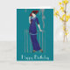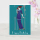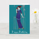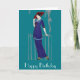 Tarjeta de cumpleaños feliz con una elegante dama inspirada en la era de la moda Art Deco de los años 20. Esta dama de moda lleva un vestido azul y el gorra rojo tiene un fondo de color verde azulado personalizable.
