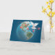 Navidades paloma blanca con un signo de Paz en una cuerda rayada roja y blanca en un mundo con estrellas. Se puede cambiar el fondo azul.