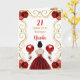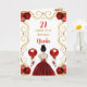 Esta invitación a la tarjeta de cumpleaños incluye un marco dorado elegante, una bella princesa con el pelo castaño y un vestido rojo, flores y un globo.