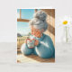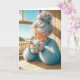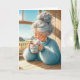 La luz del sol fluye a través de una ventana, iluminando a una mujer con el pelo gris en un acogedor suéter azul mientras disfruta de una bebida caliente en una taza etiquetada como "Buenos días". Se puede cambiar el texto interior.