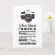 Una tarjeta de felicitación en blanco y negro con una imagen de una cámara con una cita esclarecedora y motivadora sobre la vida y cómo deberíamos afinar nuestra perspectiva. "La vida es como una cámara. Centrarse en lo que es importante, capturar los buenos tiempos, desarrollarse a partir de lo negativo, y si las cosas no salen - tomar otra inyección". Se desconoce el autor de la cita. El diseño y la cita son excelentes para los fotógrafos o para cualquiera que necesite recogerme en la vida. El diseño se trata con efecto de grunge claro.