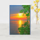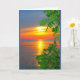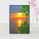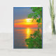 Una fotografía de una puesta de sol naranja, amarilla y azul del lago, enmarcada por ramas verdes brillantes, es el tema de mi carta "Pensando en ti en el atardecer del lago Winnebago". Capté esta escena a lo largo de la costa del hermoso lago Winnebago en Quinney, Wisconsin.