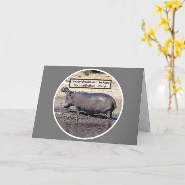 ¿Te pones el pie en la boca otra vez? ¿Necesita disculparse? Tal vez un poco de HUMOR junto con la disculpa ayudará a hacerlo más fácil. La tarjeta muestra la foto de HIPPO con la boca abierta y el texto: "Realmente debería aprender a mantener mi boca cerrada. ¡Lo siento!" Y dentro: "Espero que me perdones" Se puede cambiar el texto en el frente y en el interior.