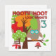 Búho camisetas de cumpleaños 3, trajes para el cuerpo, tazas, imanes, agujeros, posters, bolsas, y más con un búho, muchos árboles, y texto que dice "¡Hooty Hoot Look Whoo's 3!"