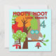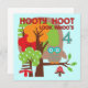 Búho camisetas de cumpleaños 4, trajes para el cuerpo, tazas, imanes, agujeros, posters, bolsas, y más con un búho, muchos árboles, y texto que dice "¡Hooty Hoot Look Whoo's 4!"