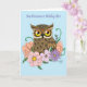 Pequeña lechuza marrón lindo sentada entre flores de pasta rosada, melocotón y morada Primavera en el fondo azul claro