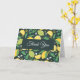 Tarjeta de saludo con un lindo patrón de limones amarillos y fruta de cal verde con tallos de hojas sobre un fondo verde oscuro.
