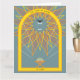 Un León geométrico de la tribu de Judá ruge mientras el niño Jesús en un pesebre levanta sus manos.