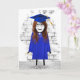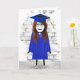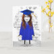 Chica de palo con pelo largo, diploma de graduación, zapatillas de deporte, gorra azul, y vestido para felicitaciones de graduación.