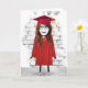 Chica de palos con pelo largo, diploma de graduación, zapatillas de deporte, gorra roja y vestido para felicitaciones de graduación.