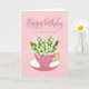 Una pintoresca taza de té rosada llena de un hermoso ramo de flores del valle junto con las palabras con letras de la mano Feliz cumpleaños en la parte superior de la carta y las palabras con letras de la mano 39 hoy con corazones de amor en la taza de té. ¡Una dulce tarjeta de cumpleaños para tu tía que cumple 39 años hoy!