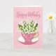 Una pintoresca taza de té rosada llena de un hermoso ramo de flores del valle junto con las palabras con letras de la mano Feliz cumpleaños en la parte superior de la carta y las palabras con letras de la mano hoy 62 con corazones amorosos en el vaso de té. ¡Una dulce tarjeta de cumpleaños para alguien especial que cumple 62 años hoy!
