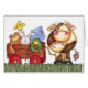 Tarjeta linda de la vaca que dice. vaca que tira de un carro por completo de juguetes.