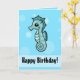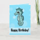 Una tarjeta de cumpleaños con un adorable ilustracion digital de un lindo caballito de mar personalizado azul sobre un fondo cubierto de burbuja verde marino. ¡Puedes personalizar todo el texto para hacerlo tan individual como quieras!