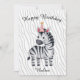 A birthday card for anyone who loves, or are fascinated with, Zebras. Especially for a child -- as the message on the back also emphasizes. The design features a cute caricature of a small Zebra wearing a party hat and set on a background of simulated Zebra stripes. All text is easily changed by using the template. For other desired changes (different type font, color, size or placement) select "Personalize this template" then select "Edit using Design Tool." You may want to scroll down to the section "Transfer design to a product" for a few suggestions about other card styles this design can be used on.