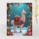 Tarjeta Llama festiva lleva regalos en escena nevada
